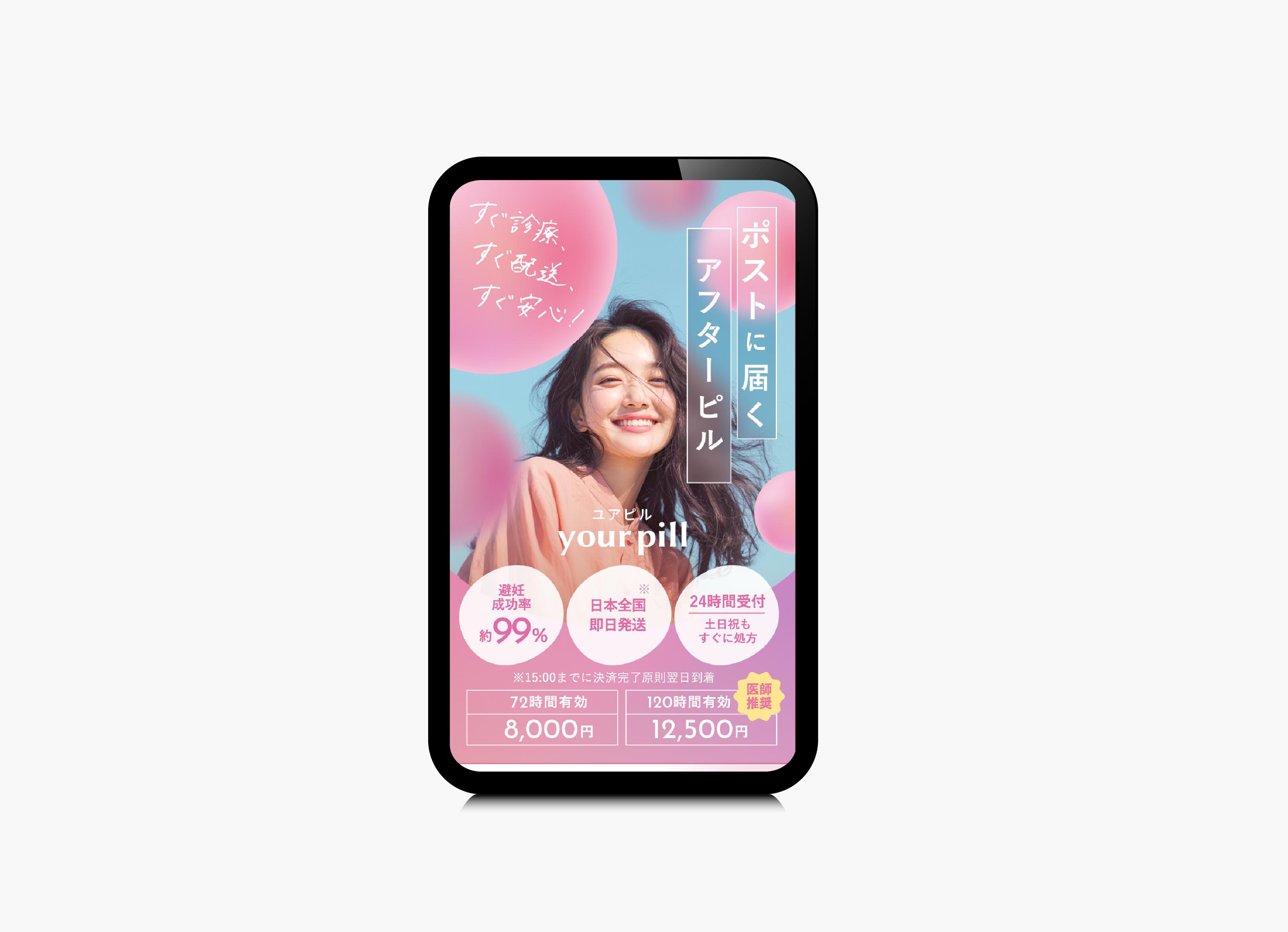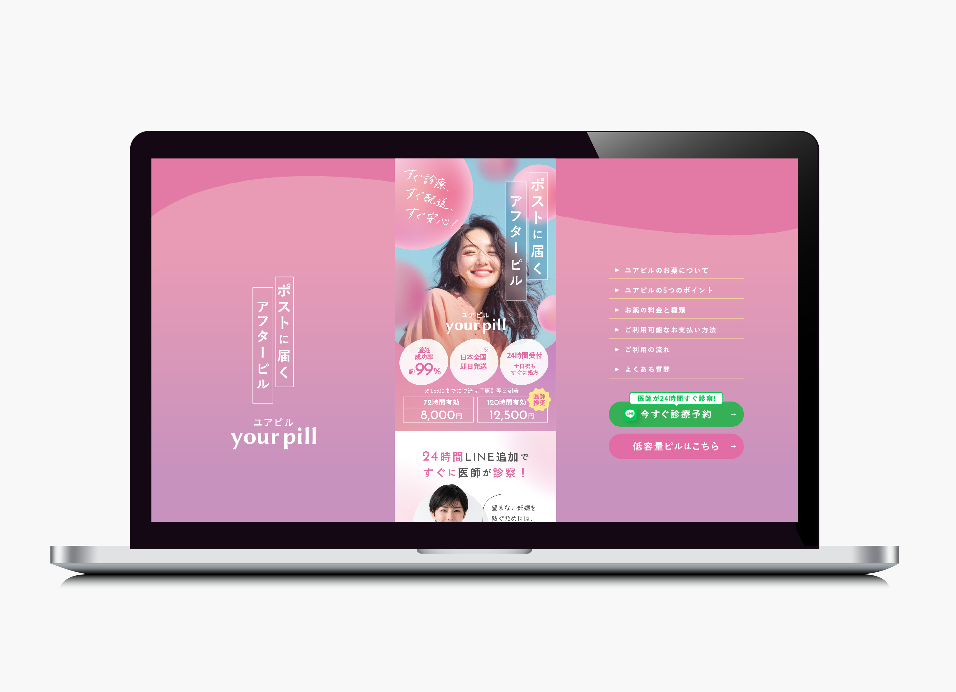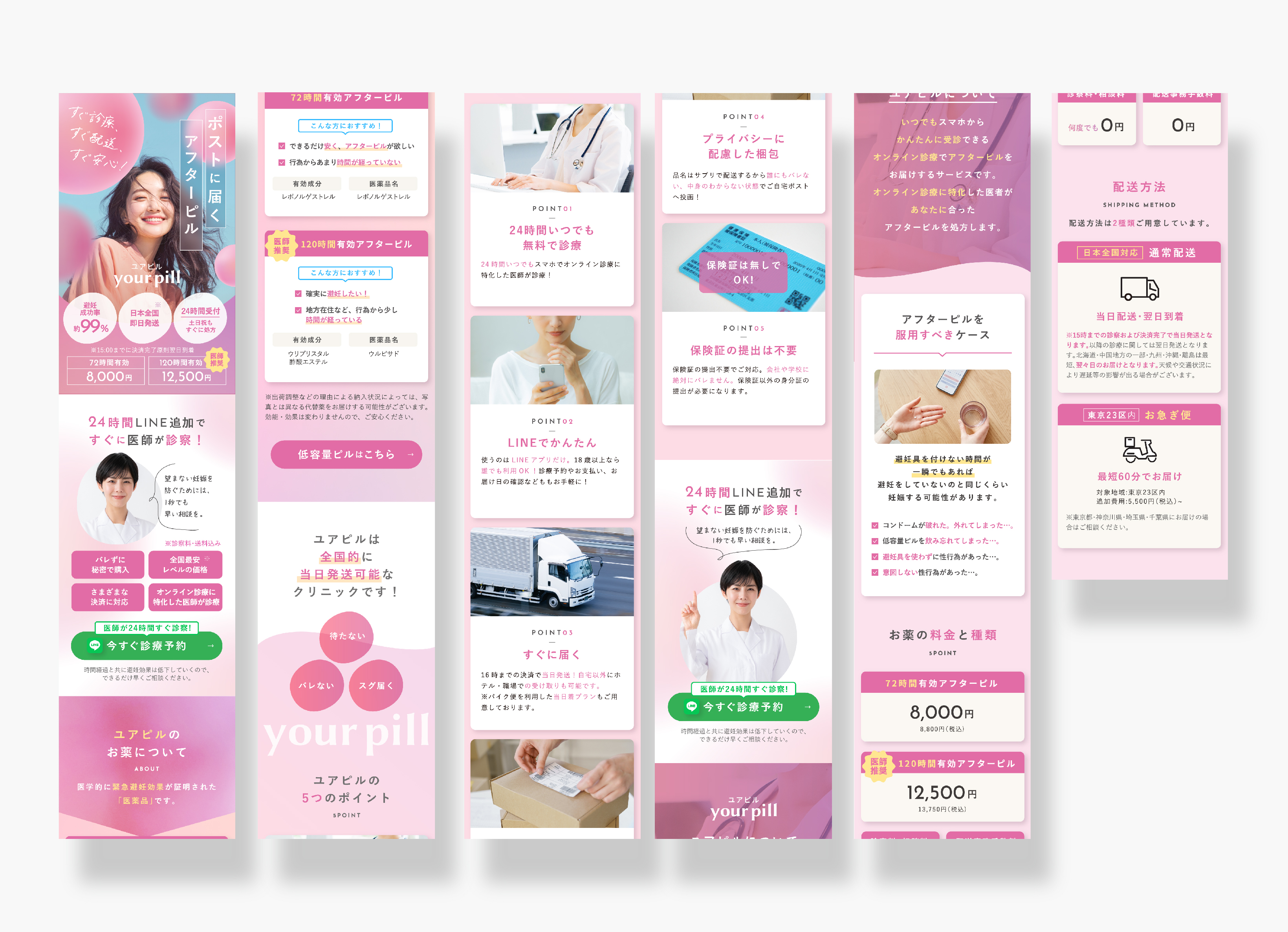 少し青みのあるピンクと十分な余白でやさしく安心できる印象をつくり、迷わず行動へつなげるLPを目指しました。
